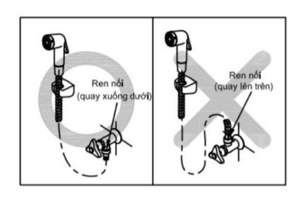 Để đảm bảo nguồn nước dẫn lên không bị yếu thì bạn không nên lắp đầu ren dây vòi xịt nối với đường cấp nước theo hướng lên trên