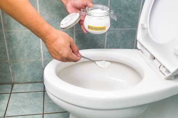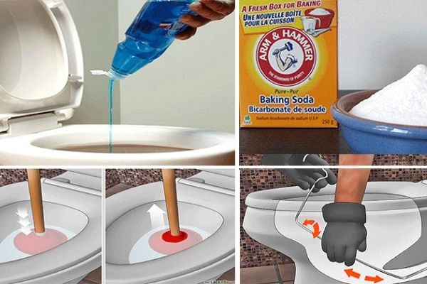Hòa trộn 500g baking soda, 500ml giấm ăn cùng 3 lít nước nóng. Rồi đổ hết hỗn hợp vào bồn cầu khoảng 7-10 tiếng. Xả nước và tiếp tục sử dụng