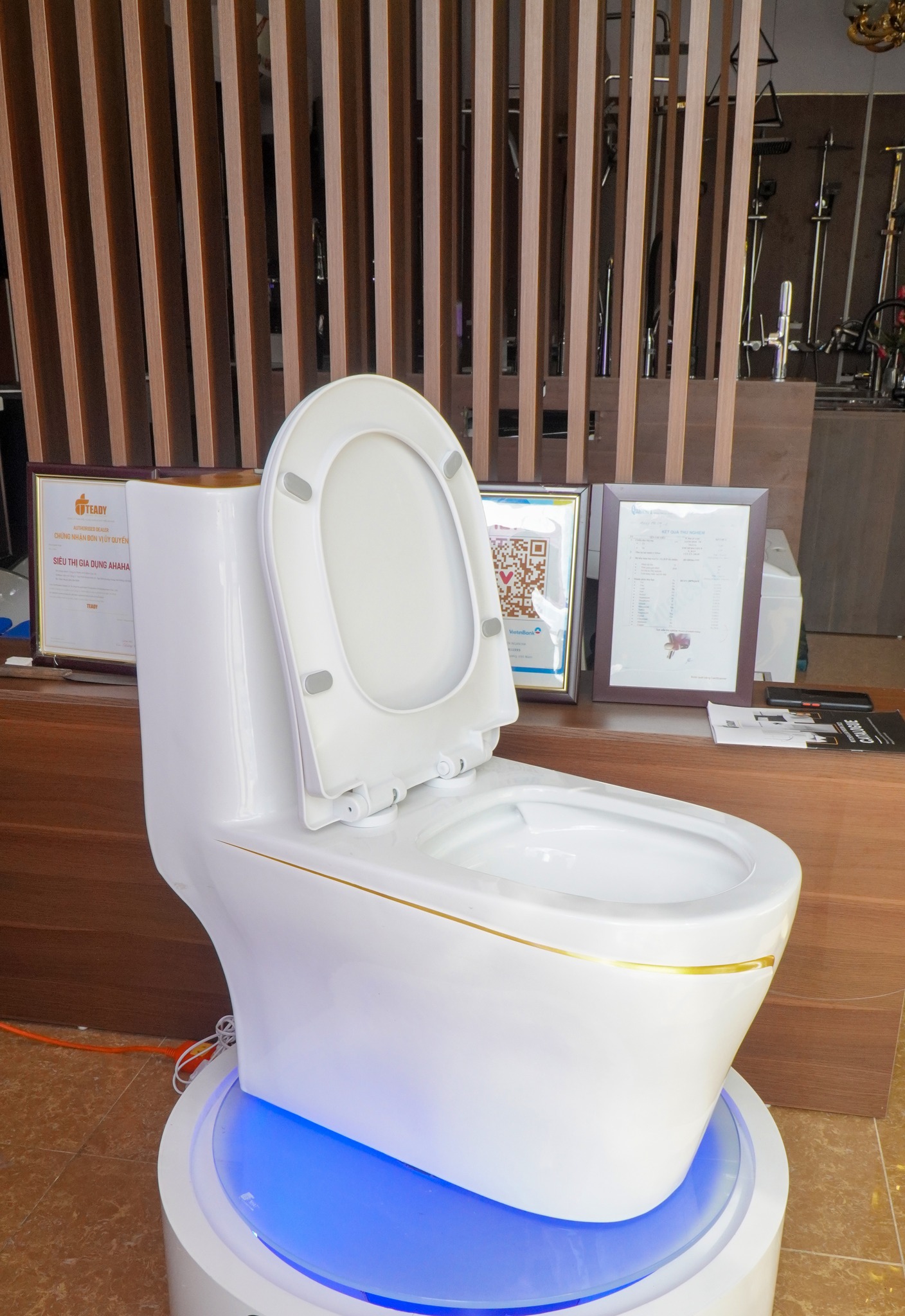 bồn cầu chính hãng với thiết kế sang trọng, một màu vàng gold đầy quý phái, tạo điểm nhấn nổi bật cho không gian